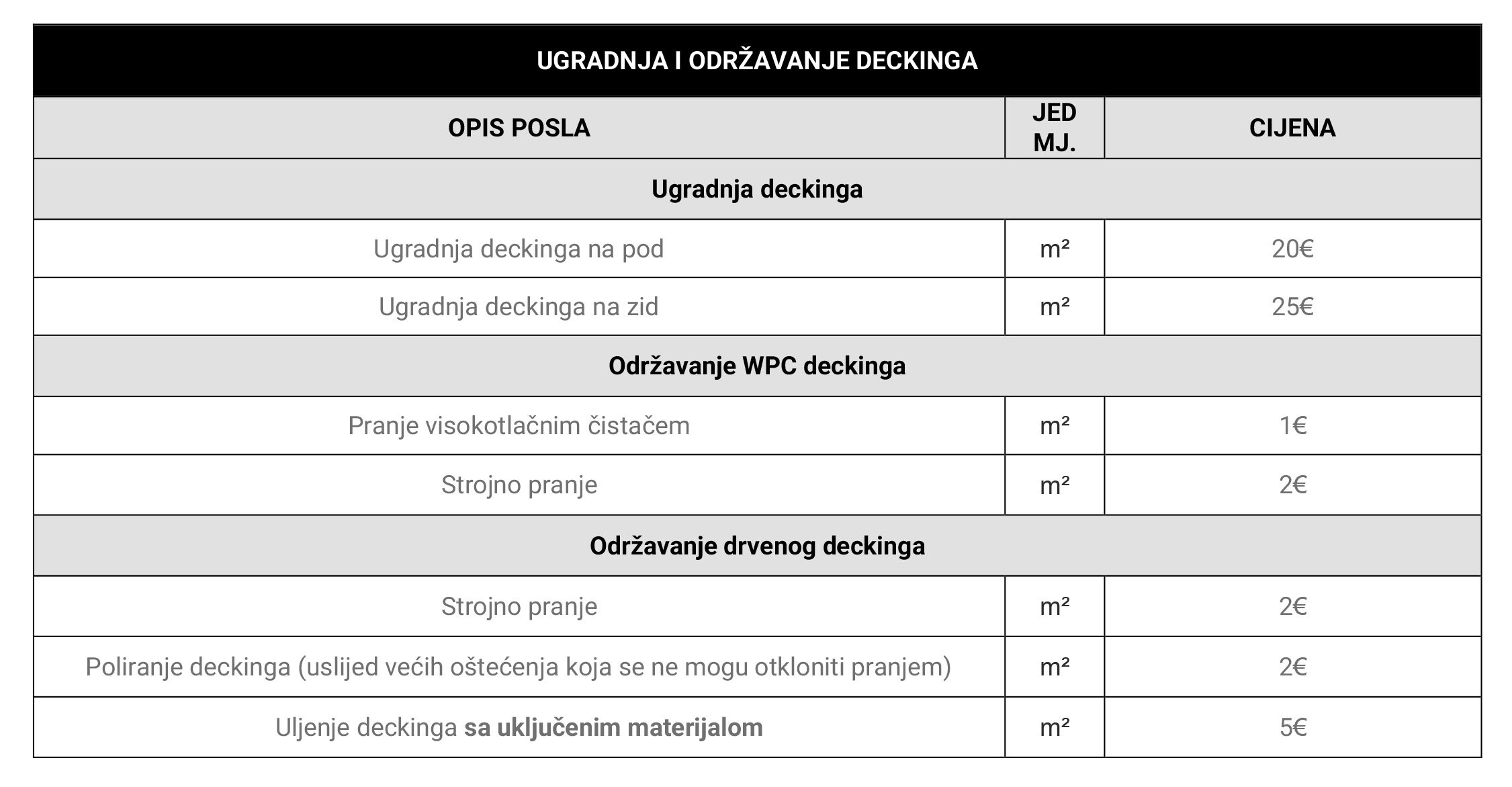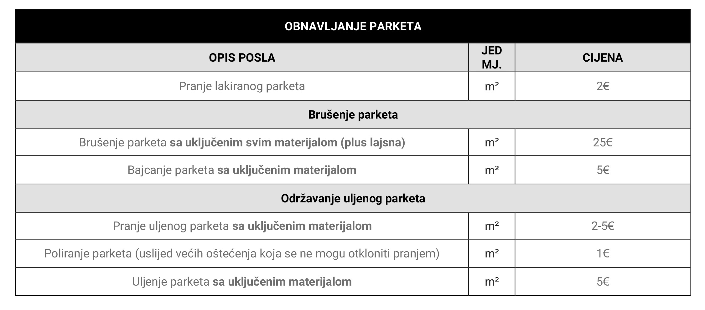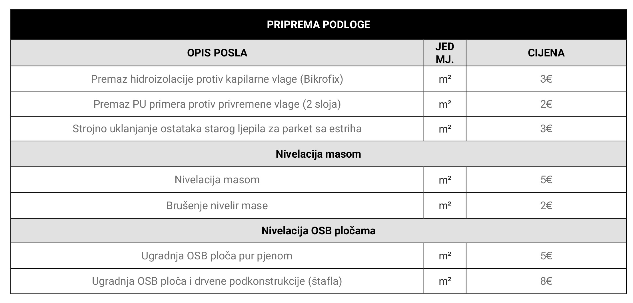 Iskazane cijene su informativne i služe kao orijentacija. U građevinarstvu svaki projekt ima svoje specifičnosti, pa konačna cijena može biti niža ili viša, ovisno o stvarnom stanju na terenu. Točnu procjenu možemo dati nakon pregleda posla na licu mjesta.