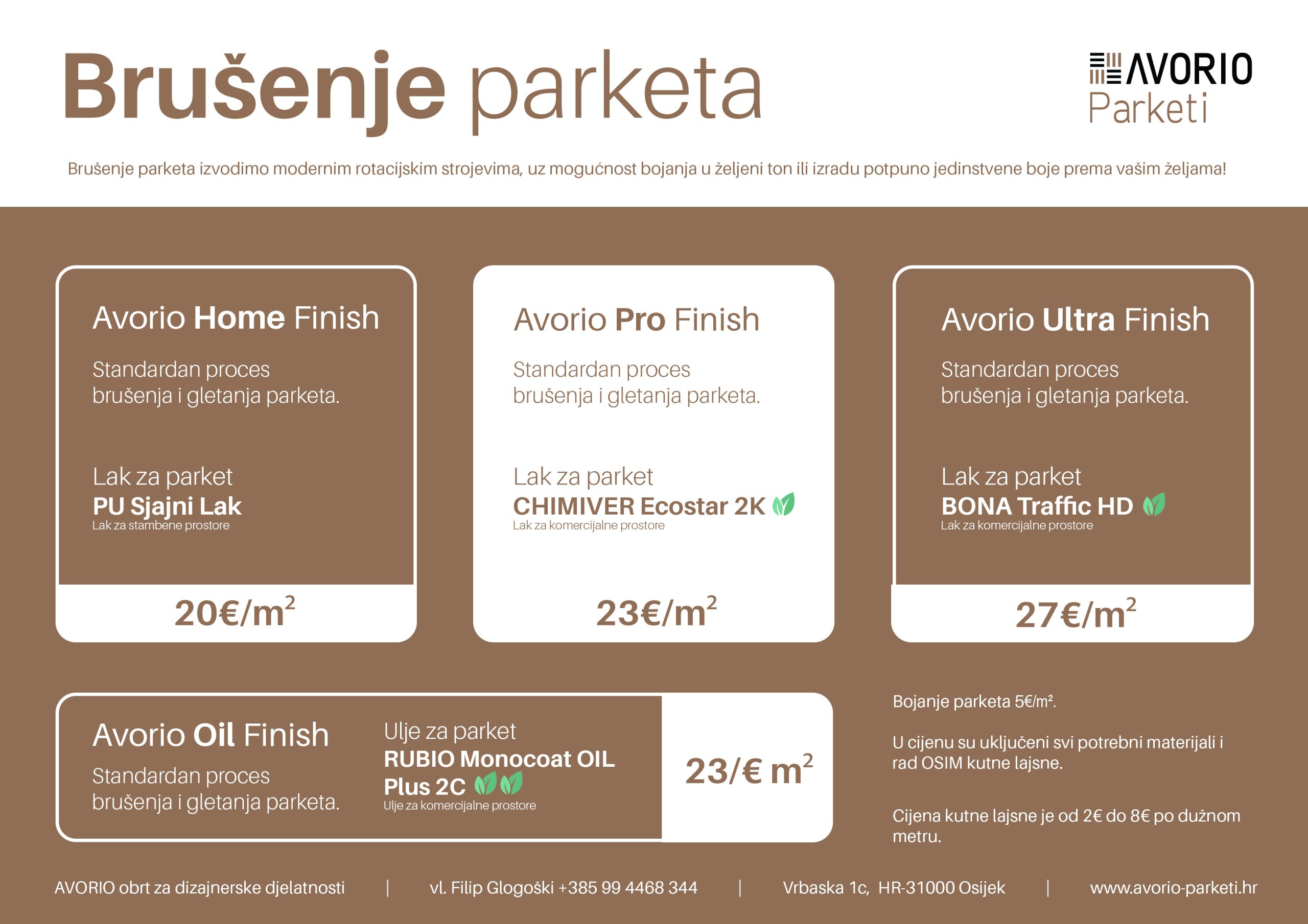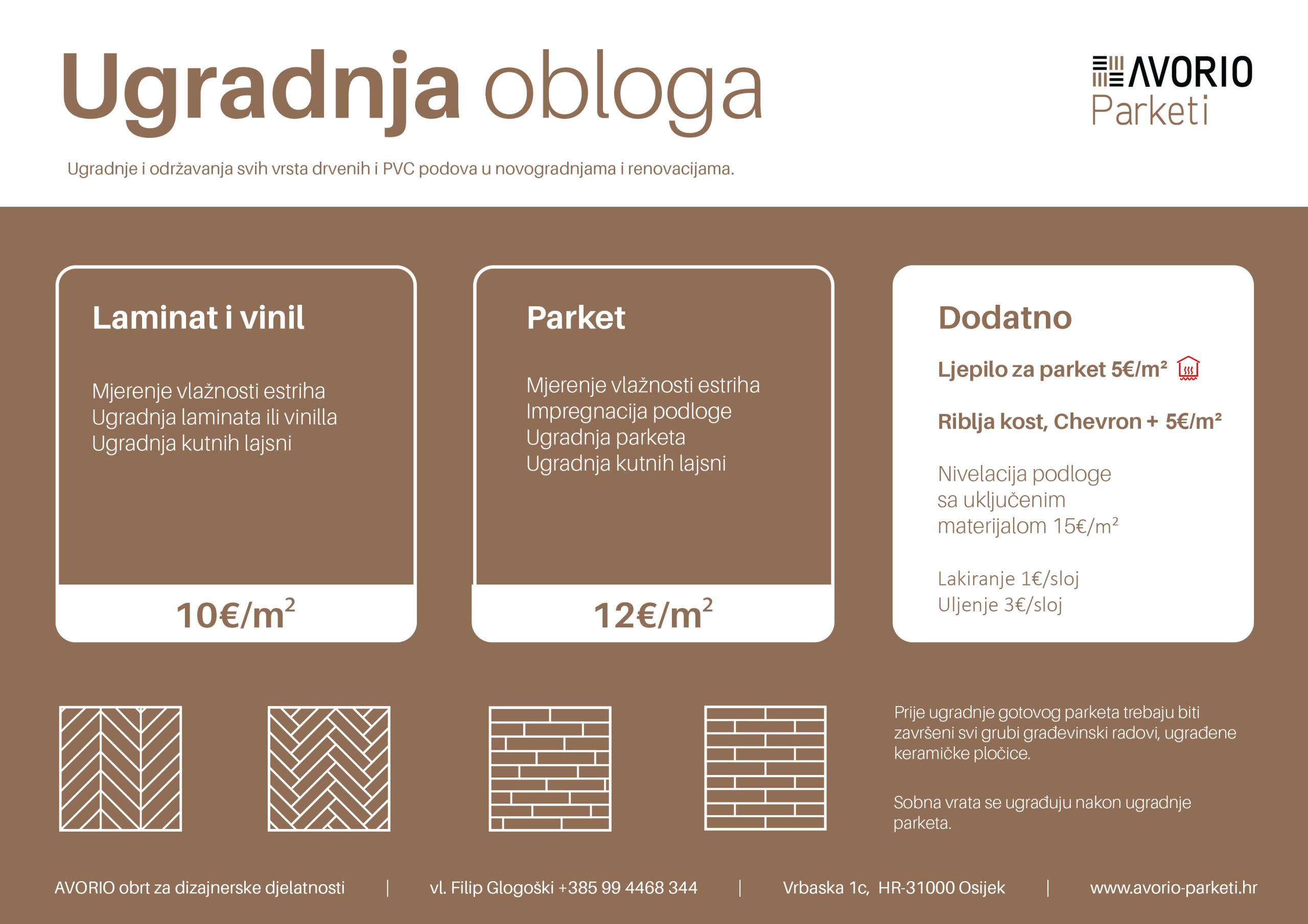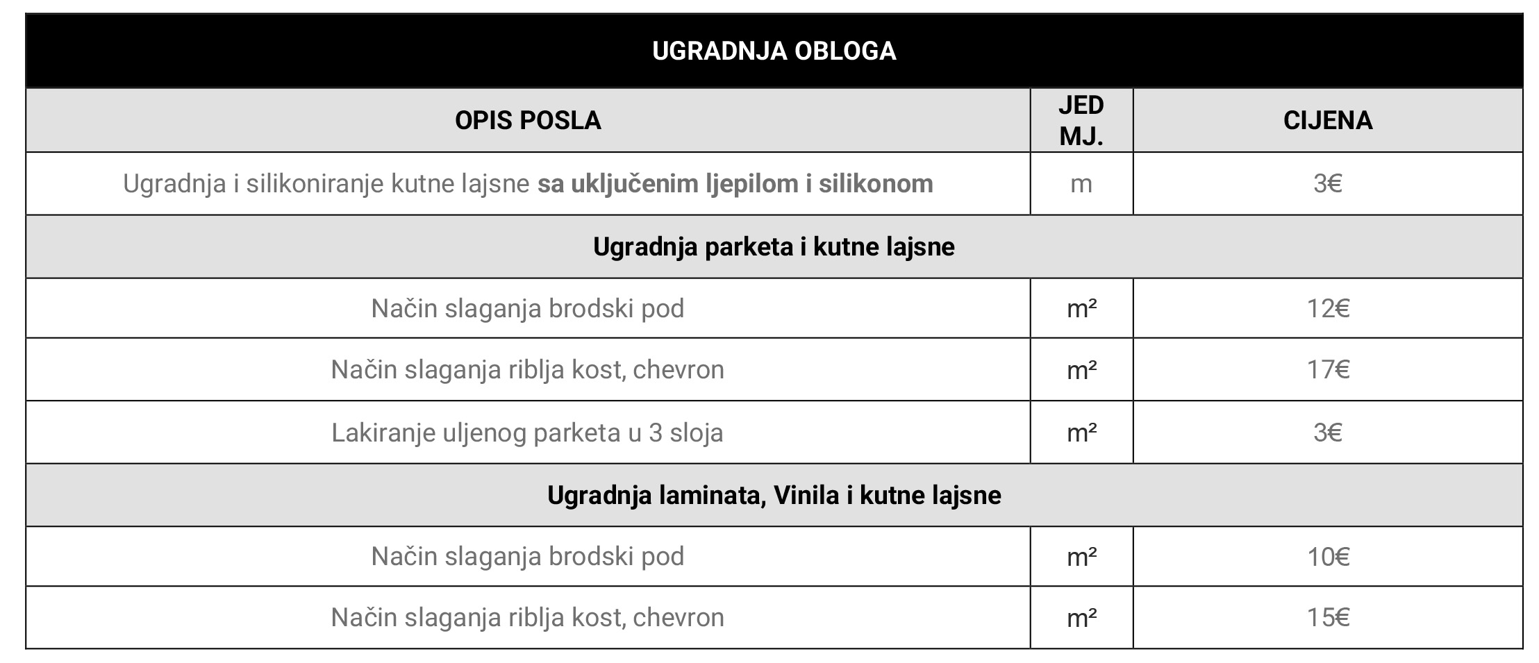 Iskazane cijene su informativne i služe kao orijentacija. U građevinarstvu svaki projekt ima svoje specifičnosti, pa konačna cijena može biti niža ili viša, ovisno o stvarnom stanju na terenu. Točnu procjenu možemo dati nakon pregleda posla na licu mjesta.
